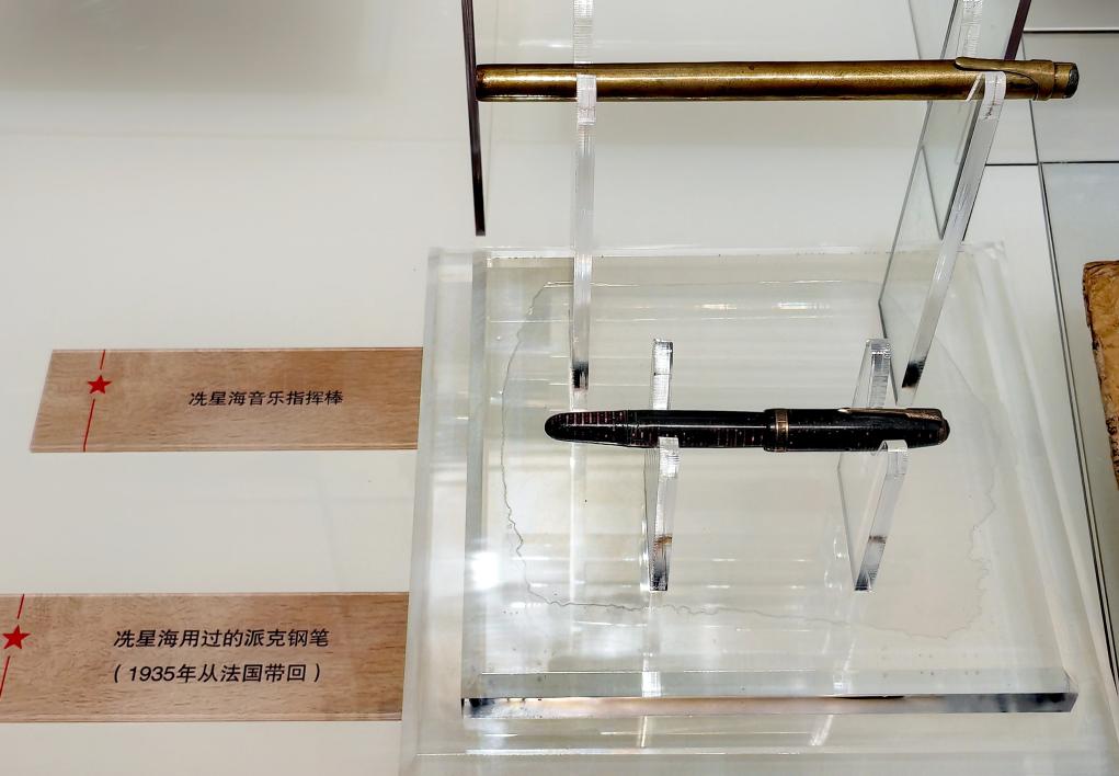 Taktobastono kaj plumo uzitaj de Xian Xinghai, eksponitaj en la mMemorhalo pri Literaturo kaj Arto de Yan'an.