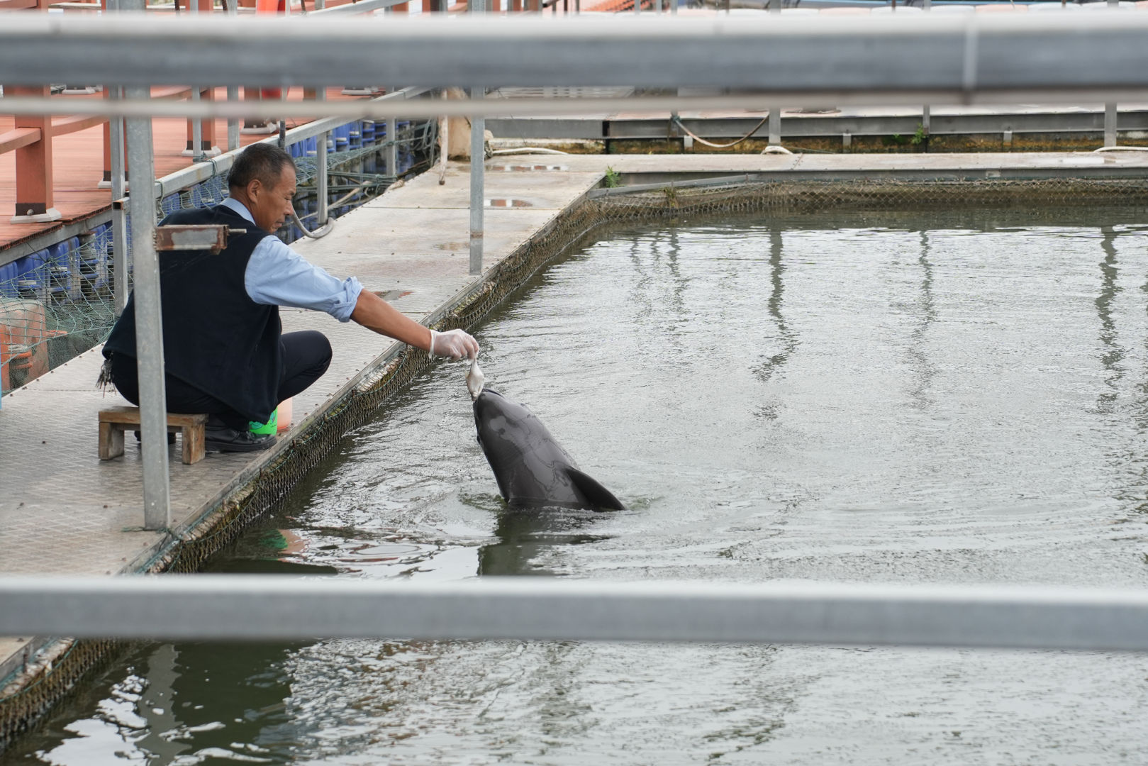Esploristo manĝigas jangzian delfenon en la rezervejo