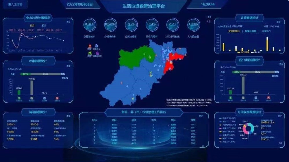 La cifereca rub-trakta platformo por la solida rubo de Hangzhou funkcias kiel efika "cifereca cerbo", ĝi konektas real-tempe kun 7 361 rubkolektejoj, 1 780 rubkolekt-veturiloj, 9 forbruligejoj kaj 11 manĝaĵrub-traktejoj en la urbo. Per la dinamika daten-monitora sistemo, la movado de ĉiu sako da rubo estas klare spurebla.