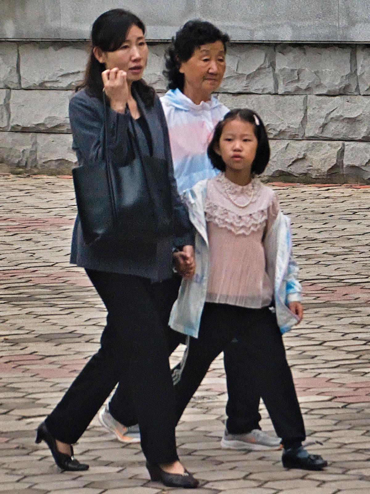Virinoj de tri generacioj de la sama familio kunpromenas en Pjongjango, Korea Popola Demokratia Respubliko.