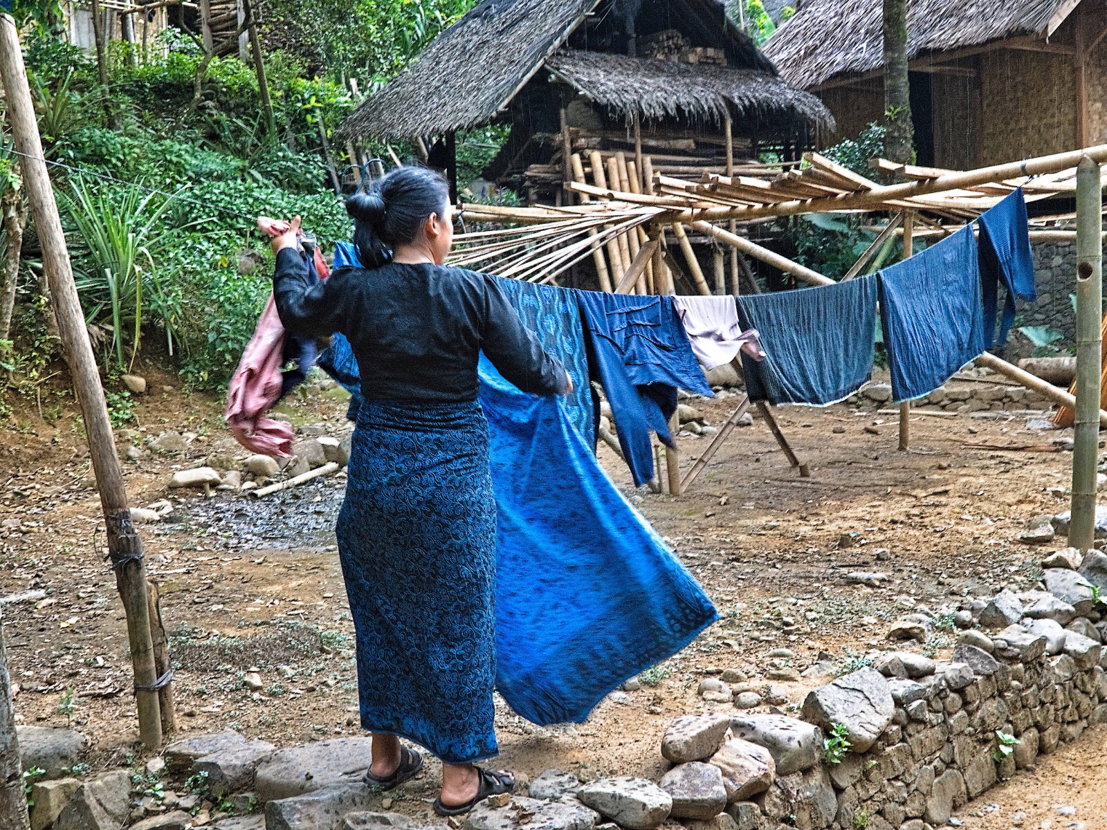 Virino de la indiĝena popolo Badui en Indonezio okupiĝas pri hejma laboro.
