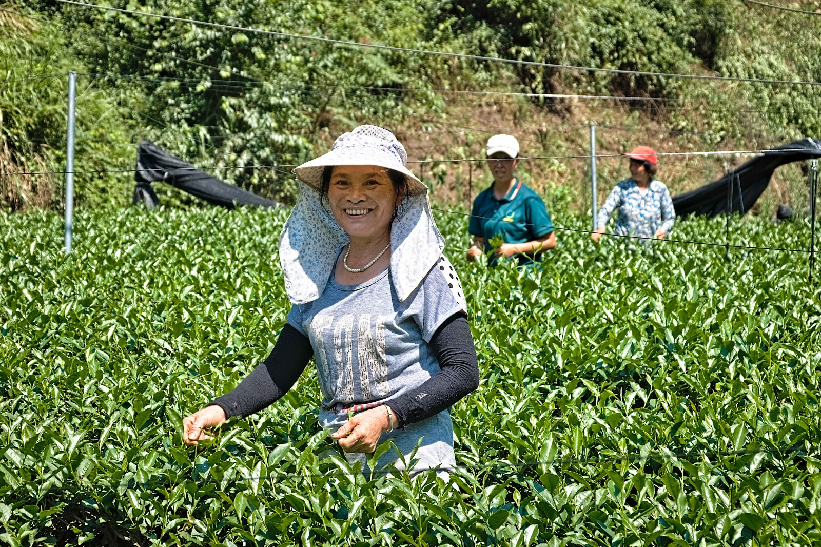 Virinoj plukas teon en Hubei-provinco de Ĉinio