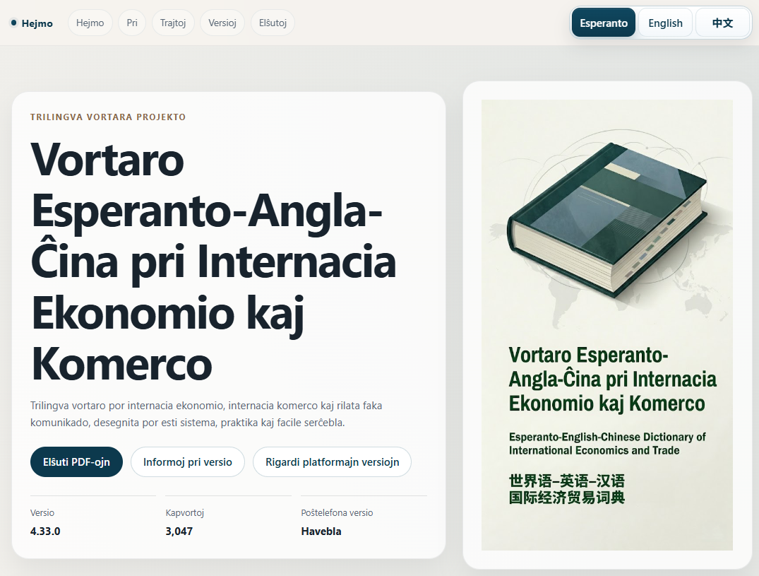 En la kampoj de internacia ekonomio kaj internacia komerco, la bezono je fidindaj kaj facile konsulteblaj terminologiaj iloj estas delonge sentebla. Por esperantistoj laborantaj en la kampoj de internacia ekonomio kaj komerco, tradukistoj, studentoj kaj legantoj de plurlingvaj komercaj materialoj, la manko de moderna faka vortaro ofte malfaciligas precizan kaj stabilan lingvan laboron. Sed, nun la malfaciloj solveblas: lastatempe estis publikigita la Vortaro Esperanto-Angla-Ĉina pri Internacia Ekonomio kaj Komerco en elektronika formo.