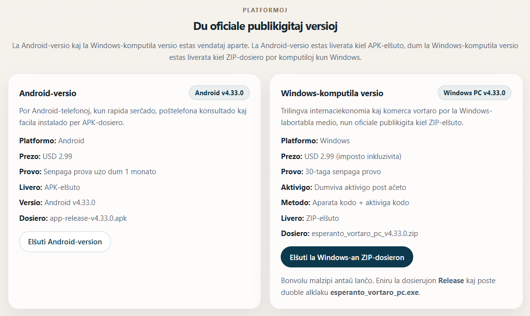 Oni klopodis konservi la normecon kaj kompreneblecon de la Esperantaj kapvortoj, samtempe traktante ĉefajn kapvortojn, "vidu"-rilatojn kaj proksimsignifajn limojn tiel, ke la vortaro estu vere uzebla, ne nur teoria. Aparte interesa estas la praktikaj versioj. La Android-versio celas rapidan serĉadon kaj oportunan konsultadon per poŝtelefono, dum la Vindosa versio provizas pli stabilan uzadon ĉe skribotablo aŭ portebla komputilo. Tiel la sama vortara kerno povas servi al malsamaj bezonoj: rapida serĉado aŭ pli longa laboro dum tradukado, redaktado, studado aŭ komerca verkado.