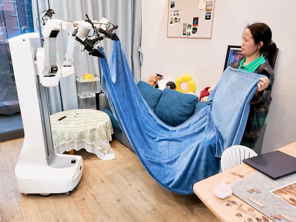 Purigisto Lei Xiaoli laboras kun la roboto por faldi lanan kovrilon.
